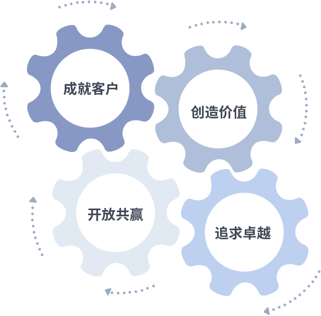 成就客户是一切决策的出发点,,创造价值是衡量所有工作的标准,,追求卓越是我们做事做人的态度,,,开放共赢是我们的格局也是最终的结果。。。价值观的齿轮环环相扣,,,推动着组织里的每个人不断向前。。。